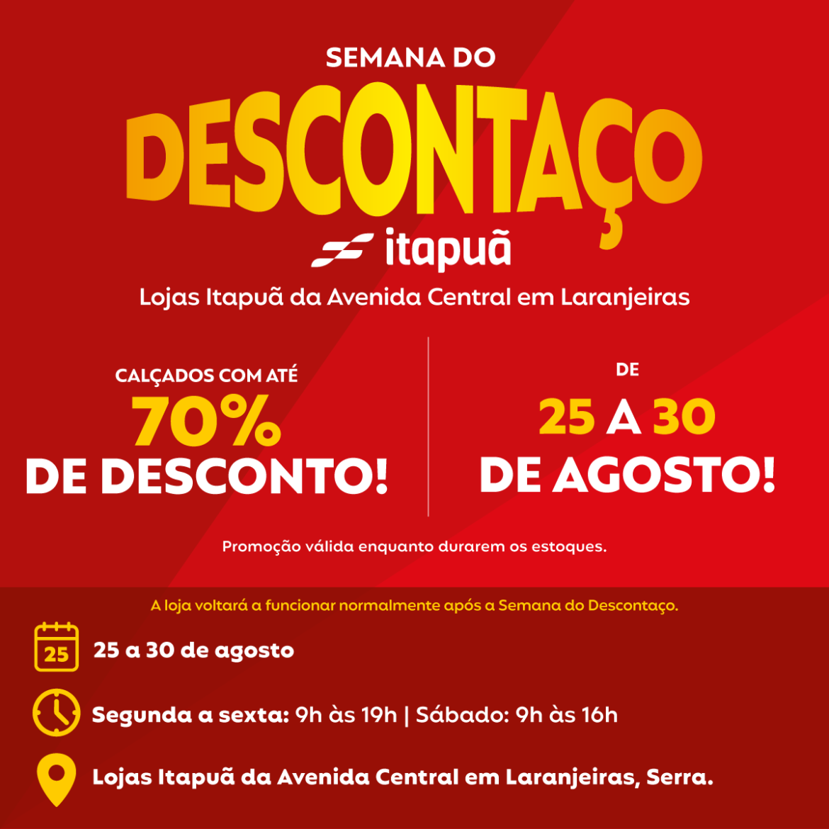 Chegou em Serra! Semana do Descontaço Itapuã traz até 70% OFF em calçados para toda a família! Se você estava esperando o momento certo para renovar os calçados da família com estilo e economia, esse momento chegou! A Semana do Descontaço Itapuã já começou, e você está convidado(a) para aproveitar descontos incríveis de até 70% em calçados das melhores marcas do mercado. ️ De 25 a 30 de agosto, as duas Lojas Itapuã Calçados de Laranjeira, Serra, estarão com ofertas imperdíveis em modelos femininos, masculinos e infantis. Tem opções para todos os estilos, idades e ocasiões! Marcas consagradas com preços especiais: Durante essa semana especial, você encontra calçados das marcas mais queridas do Brasil com descontos reais e atrativos: Vizzano e Modare – elegância e conforto para elas Olympikus e Fila – esportividade e leveza no dia a dia Democrata – sofisticação e durabilidade para eles Mizuno – desempenho e qualidade para quem ama performance E muito mais! Calçados para toda a família A Semana do Descontaço é a oportunidade ideal para renovar o estoque de calçados da sua casa com preços acessíveis. São centenas de modelos entre tênis, sandálias, sapatos sociais, rasteiras, chinelos e muito mais — tudo com o padrão de qualidade que você já conhece da Itapuã. Onde aproveitar essas ofertas? É fácil chegar! A loja fica bem no coração de Ipatinga: Lojas Itapuã Calçados da Av. Central, em Laranjeiras em Serra. Clique aqui para ver no mapa Horários de atendimento: Segunda a sexta: 9h às 19h Sábado: 9h às 14h ⚠️ Atenção: Essa é uma ação por tempo limitado! Após o dia 30 de agosto, os preços voltam ao normal e as ofertas saem das prateleiras. Não deixe para depois — venha correndo aproveitar o Descontaço Itapuã!